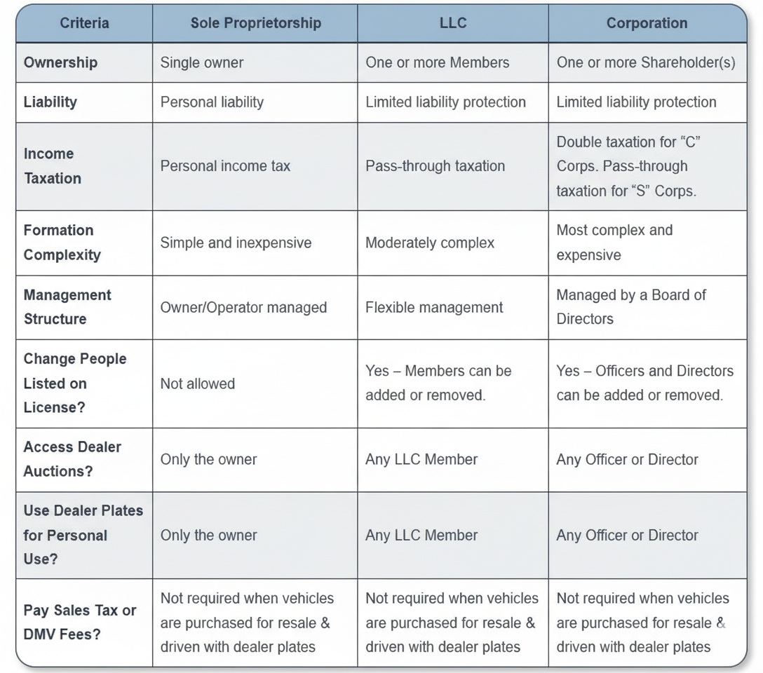 Your choice matters because the business structure you register under is tied directly to your dealer license. If you want to change it later — for example, switching from a Sole Proprietorship to an LLC — you’ll need to start over and submit a brand-new dealer license application.
